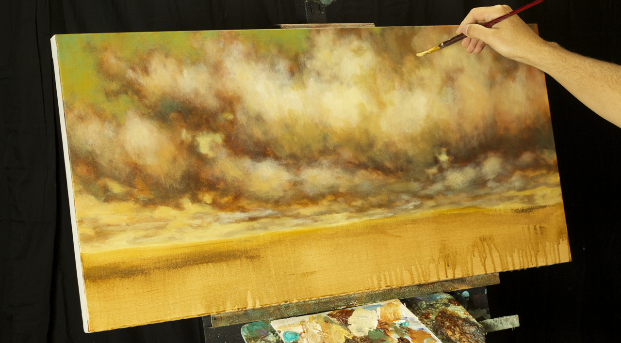 Next mix a little naples yellow with more zinc white. With a scrubbing motion redefine your horizon line and then build up the lighter color through the bottom portion of the sky.