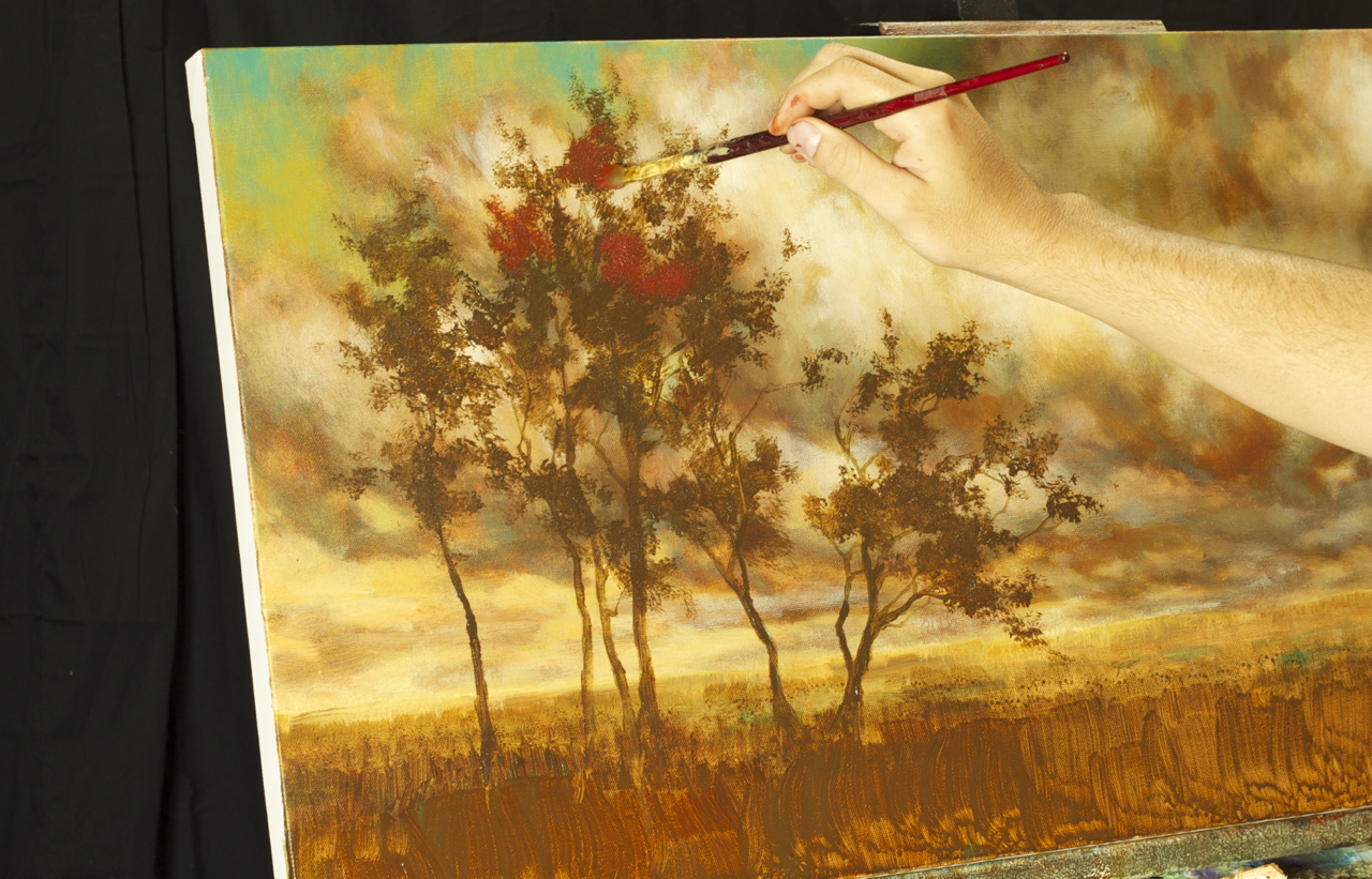 With our flat brush we can start blocking in the foliage. I like to use dabbing, choppy vertical brush strokes to define the tree. We are using raw umber with a tiny touch of burnt sienna. Make sure you allow spaces between the foliage so we can add branches, and so we can see through to the sky. You don’t want to create just a solid mass. Leaves move, and grow sporadically, so try to keep that in mind when painting the foliage.