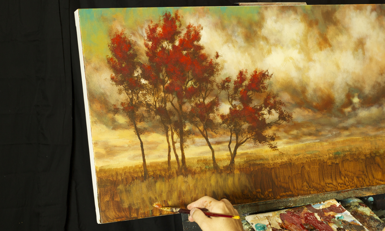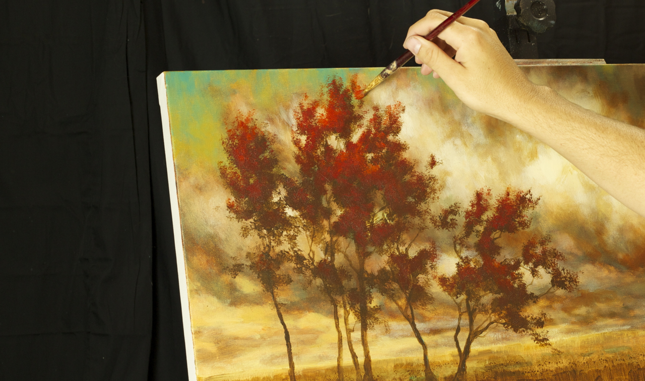 Once you’ve created a good second layer, you can start with lighter highlights. Add a little burnt sienna to the mix to harmonize it with the overall painting. Using cadmium red dark, a tiny touch of raw umber, and a small touch of burnt sienna we can create the next layer in the tree.
