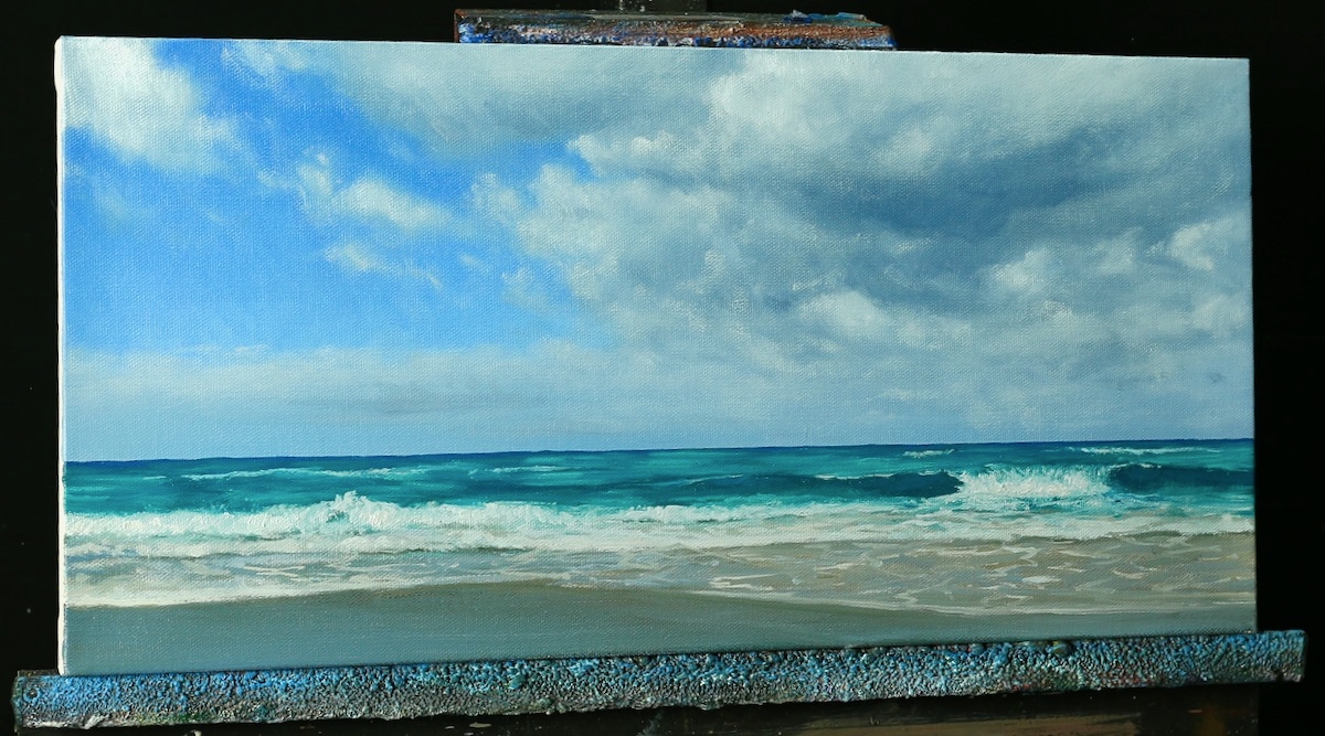 In this lesson I will take you through each step in the process. First we will create a beautiful cloudy sky. I’ll show you how to layer effectively and highlight the clouds to make them look realistic with little effort. Then we move into the ocean and paint subtle waves and ripples as the water flows onto the sand.