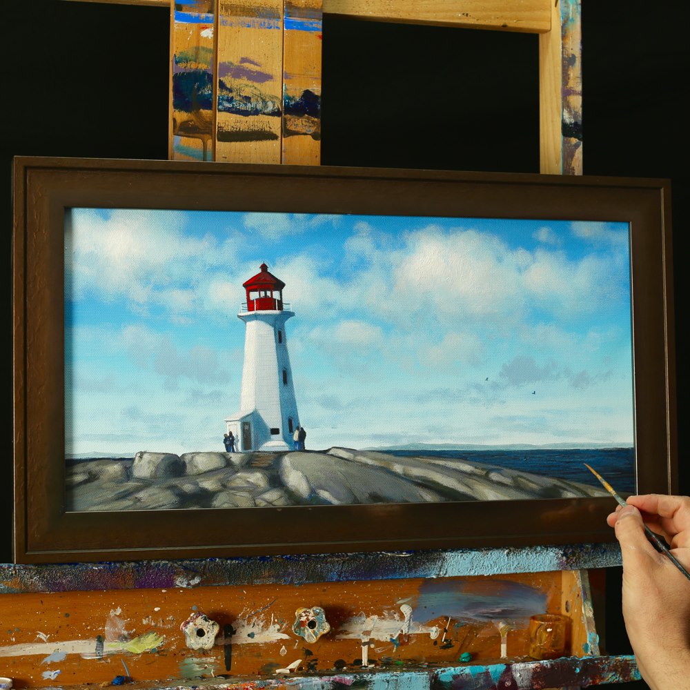 Have you ever wanted to paint a lighthouse? In this painting lesson I’ll show you how to paint Peggy’s Cover in Nova Scotia. It is a unique lighthouse set upon beautiful rocks. In this lesson I’ll take you through painting the background and clouds, drawing out the lighthouse with pencil, followed by thin paint, and moving through all the layers of the structure and rocks.