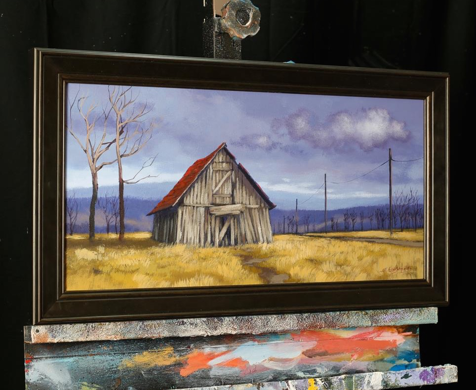 Learn how to create this great painting of a dilapidated barn in an open field, surrounded by violet hills and an old dirt road. Learn perspective for a building, a distant road and more. I’ll show you how to create this great complimentary color scheme from start to finish. You’ll learn everything from creating a nice subtle sky to how to create wispy grass in the foreground.