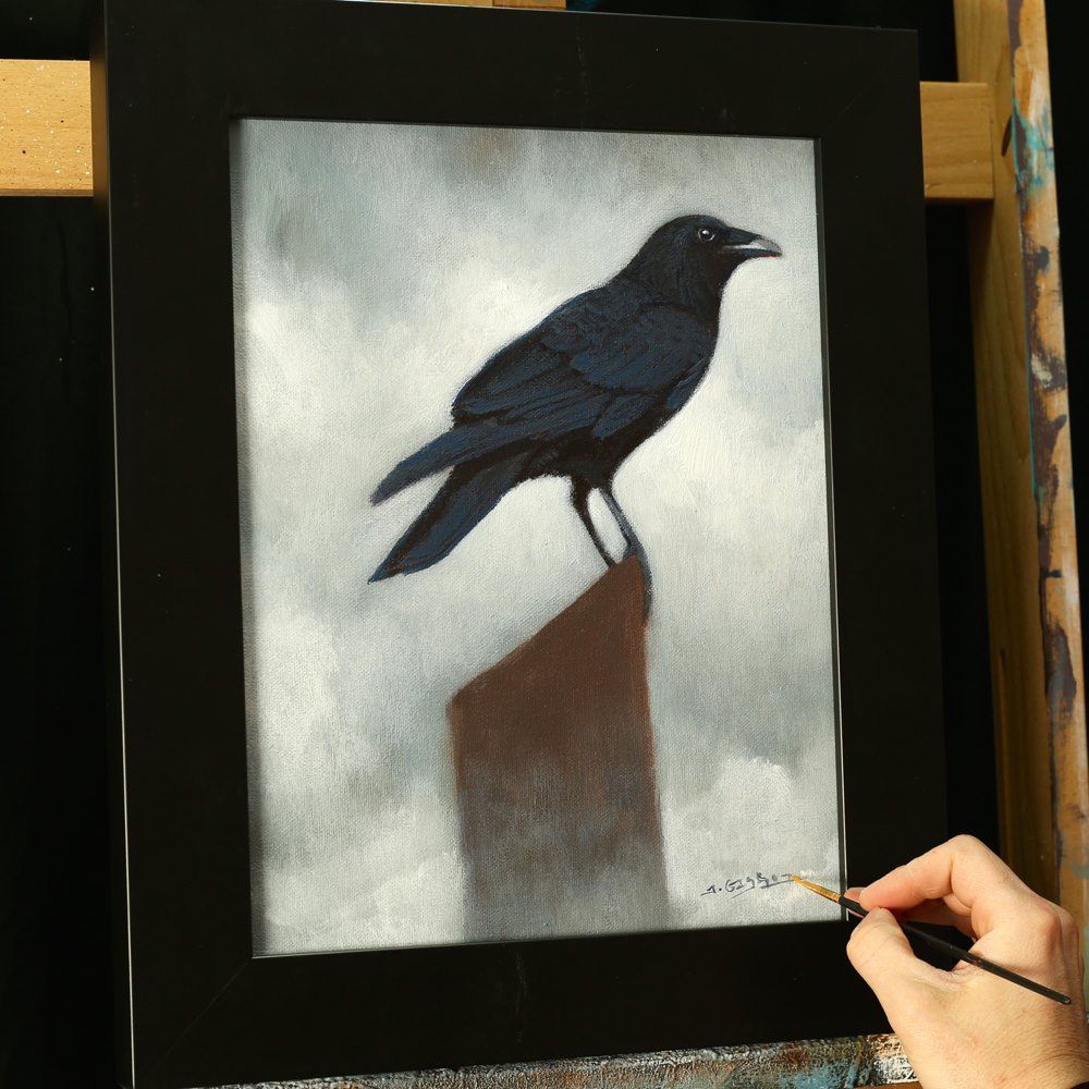 I will show you how I transfer a sketch to canvas and then from there create a tonal washed painting. Then we will begin to add layer after layer creating this great painting. I’ve included a sketch that you can transfer, or you can test your skill and create the sketch on your own. Either way you will learn every step of the way in this crow painting.